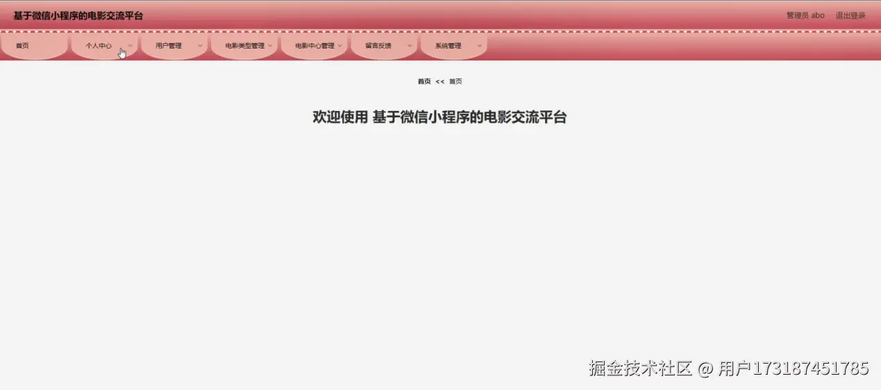 管理员登陆系统后,可以对首页、个人中心、用户管理、电影类型管理、电影中心管理、留言反馈、系统管理等功能进行相应操作,如图4-8所示。
