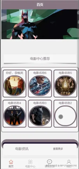 用户登陆小程序端,可以对首页、电影中心、留言反馈、我的等功能进行详细操作,如图4-3所示。