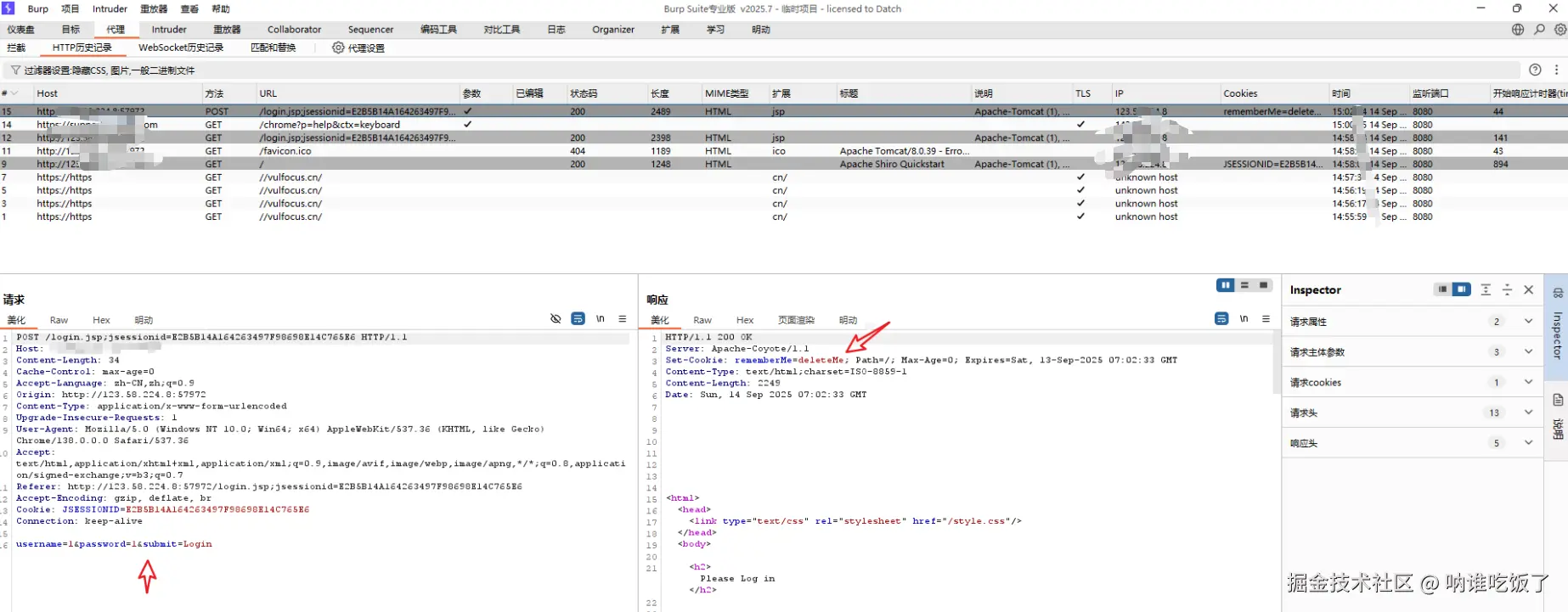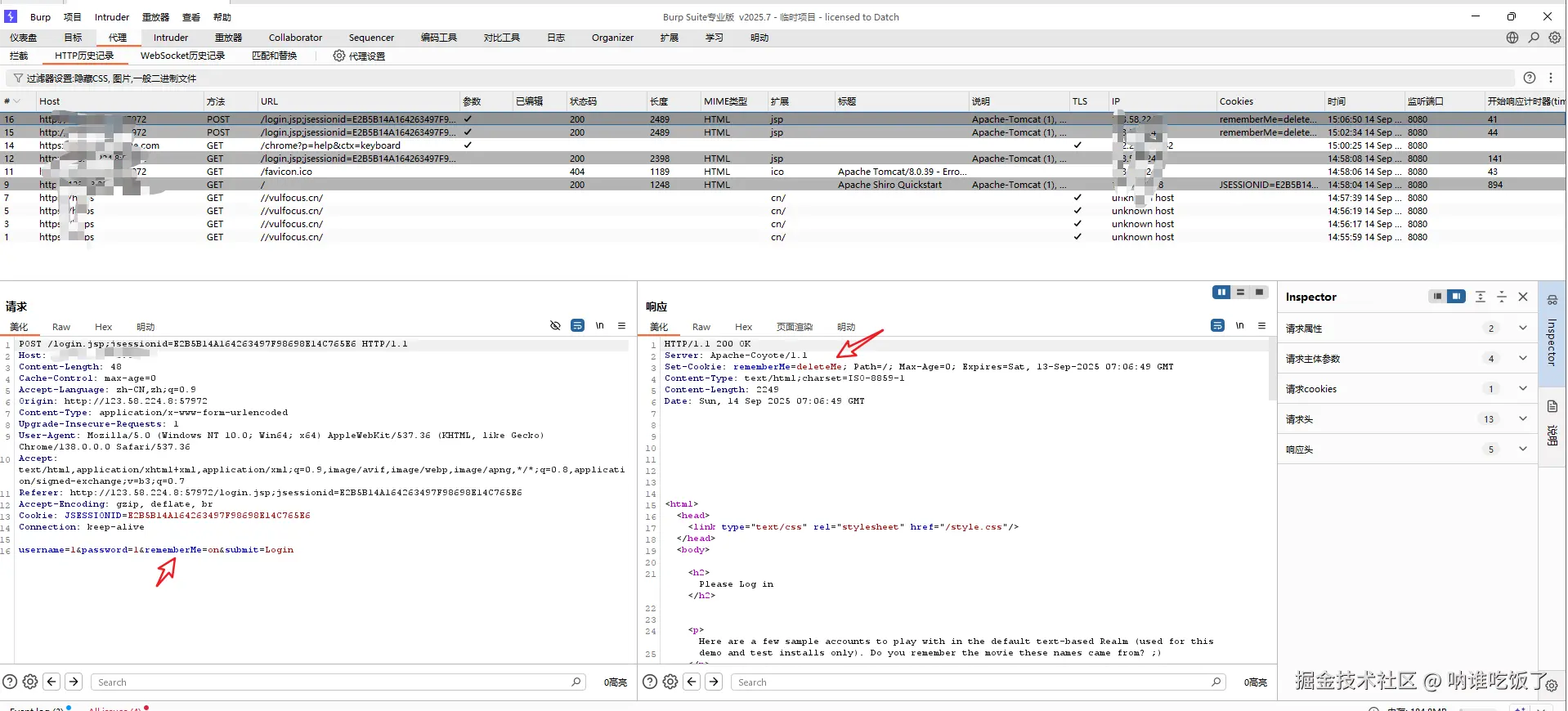 登录失败的情况下,勾选remember me,请求包的Cookie中会有RememberMe字段,返回包set-Cookie⾥也会有deleteMe字段