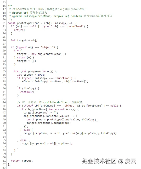 从图中可以看到这个函数的详细代码, 分析出这是一个深拷贝对象的工具函数, 那么就可以分析出这里耗时长的原因是由于需要深拷贝的对象体积过大, 导致深拷贝对象需要的时间较长, 知道原因后, 咱们可以找到调用这个函数的代码位置,改为使用浅拷贝或者移除深拷贝的方式去解决。