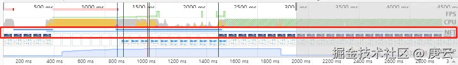 Network 概览。深蓝色表示存在高优先级的资源请求的时间段,浅蓝色表示存在低优先级的资源请求的时间段。
