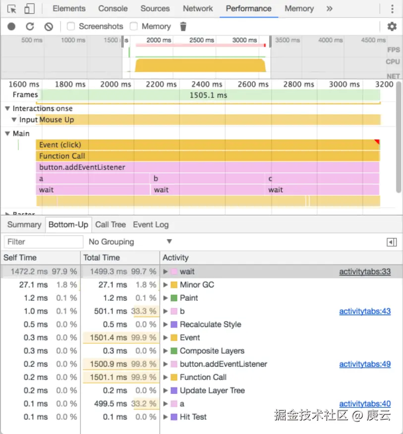 使用 Bottom-Up 可以查看哪些活动在总体上占用了最多的时间。Bottom-Up 只显示选中部分的记录。