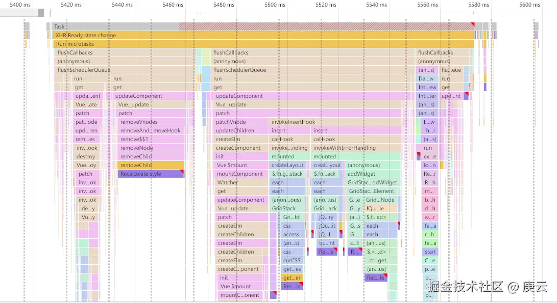 紫色(Rendering):表示样式计算和布局(重排)时间。