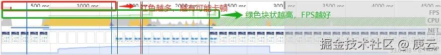 全称Frames Per Second,表示每秒传输帧数,是速度单位,用来分析动画的一个主要性能指标。 如下图所示,绿色竖线越高,FPS 越高。 红色表示长时间帧,可能出现卡顿。