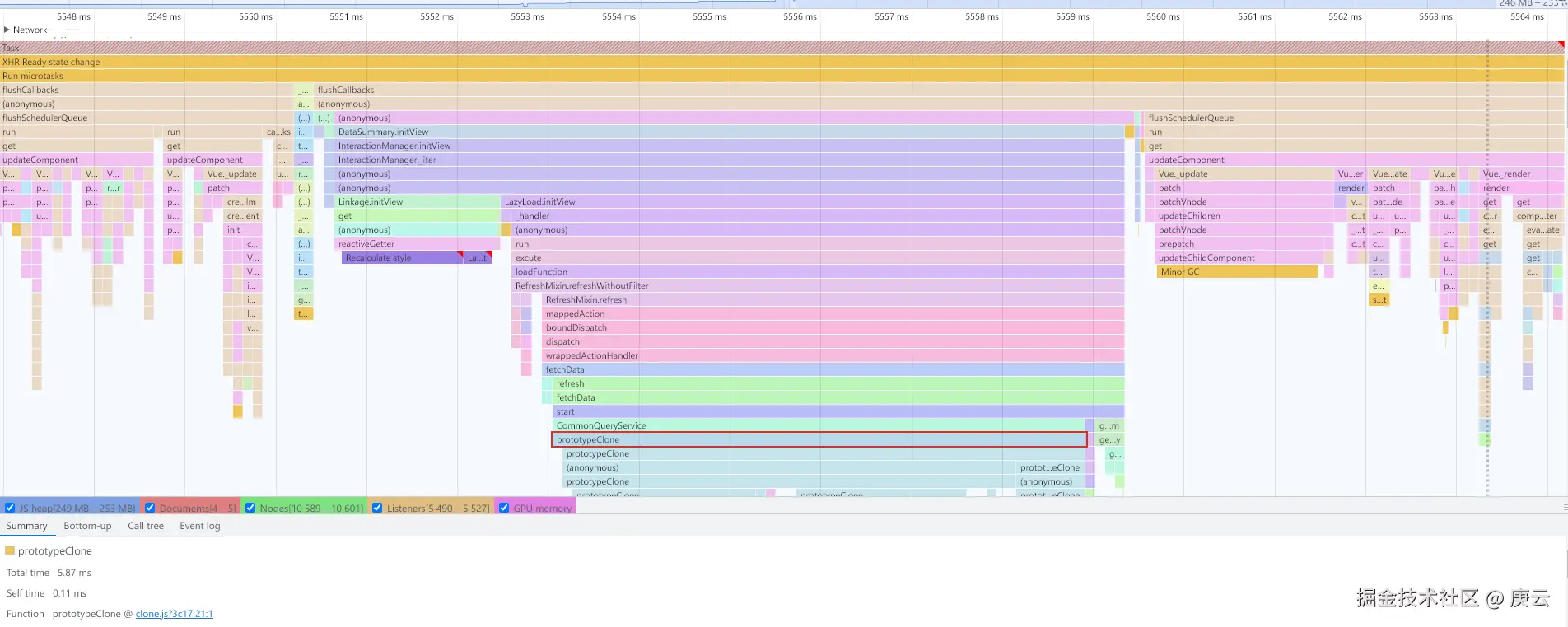 从图里的例子可以看出 prototypeClone函数占比较大, 可以查看下这个函数的作用是什么? 看是否有优化空间, 通过点击下方Summary里的代码位置, 可以得到这样的一张图