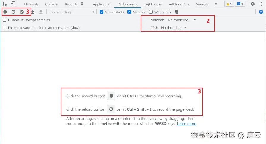 上图1、3区域按钮可以用来控制性能数据记录,黑色按钮可以记录交互阶段的性能数据,圆形箭头按钮用来记录加载阶段的性能数据。