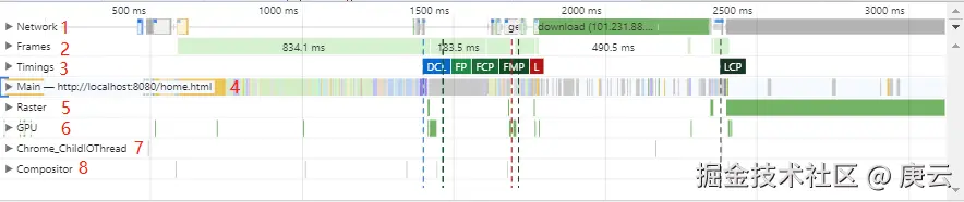 - Main(主线程):是Performance工具中比较重要的部分,记录了渲染进程中主线程的执行记录,点击main可以看到某个任务执行的具体情况