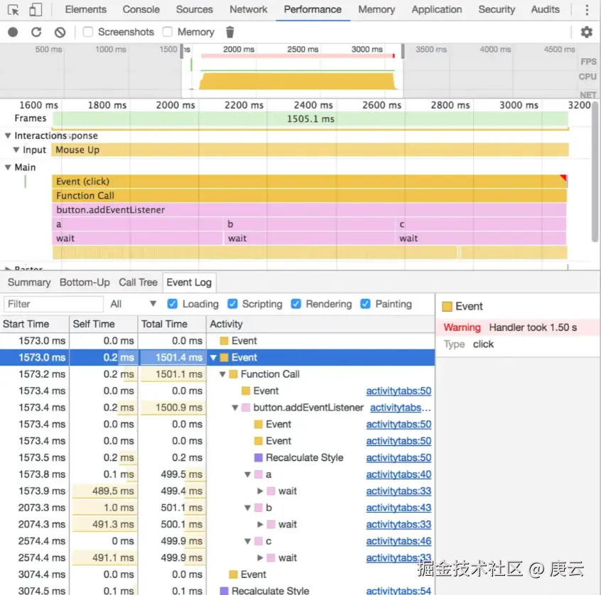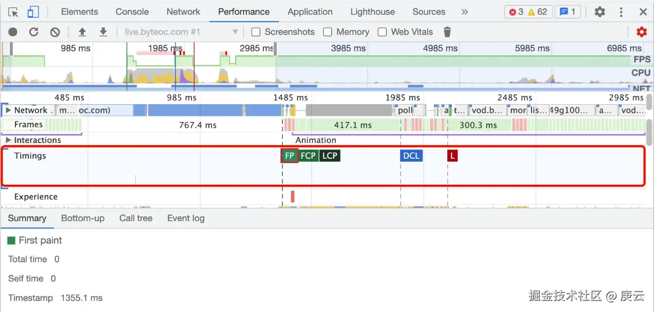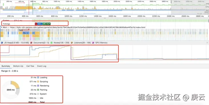 最下方就是页面的一个整体耗时概况,如果 Scripting 时间过长,则说明JS执行的逻辑太多,可以考虑优化JS,如果渲染时间过长,则考虑优化渲染过程,如果空闲时间过多,则可以考虑充分利用起来,比如把一些上报操作放到页面空闲时间再上报等。