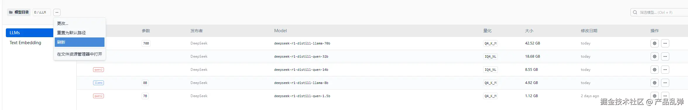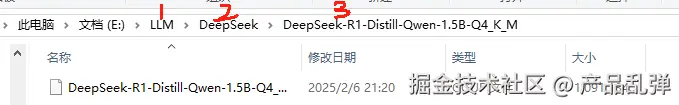 | 在磁盘下创建三级文件夹(如图所示,LLM→DeepSeek→1.5B),将gguf模型文件放置于第三层文件夹中注:这步很重要,如果没有按照要求设置,会导致读取不到本地模型 |