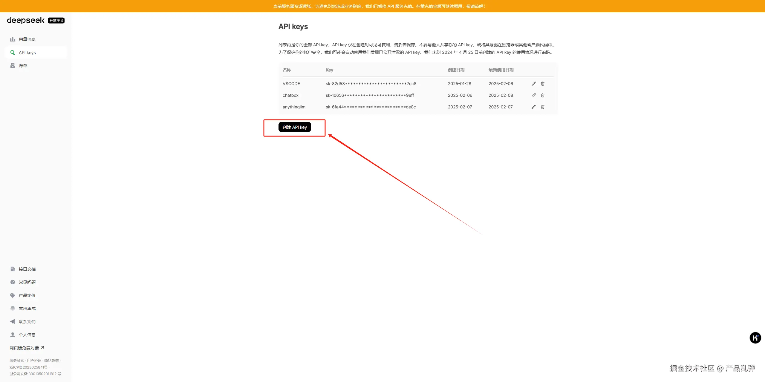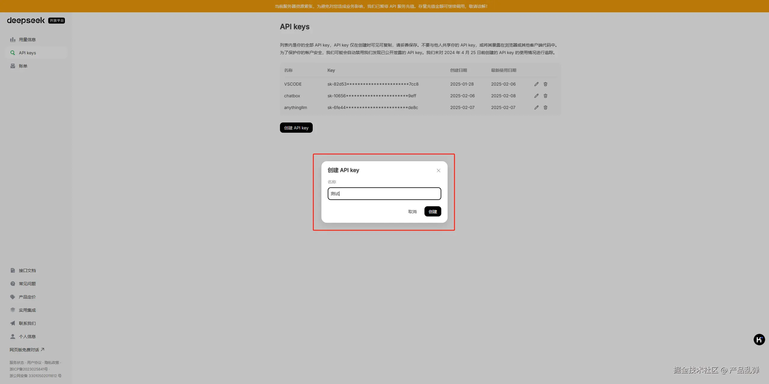 进入左侧“API keys”页面,点击“创建API key”,输入名称