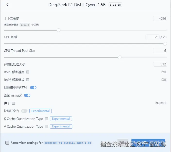 | 选择模型后需要配置模型的参数,前三个参数可根据自己的硬件调整,后面的参数按照默认设置即可,设置完成后点击“加载模型”按钮 上下文长度: 含义:模型处理文本时能够考虑的最大词元(token)数量。 调整效果:增加上下文长度可以提高模型理解长文本的能力,但会增加内存消耗和计算时间。 一般设置为2048的倍数 GPU 挂载: 含义:指定用于模型计算的GPU数量。 调整效果:增加GPU数量可以提高模型的推理速度,但需要更多的硬件资源。 CPU Thread Pool Size: 含义:指定用于模型计算的CPU线程池大小。 调整效果:增加线程池大小可以提高CPU的并行处理能力,从而提高模型的推理速度,但也会增加CPU的负载。 评估批处理大小: 含义:指定每次模型评估时处理的样本数量。 调整效果:增加批处理大小可以提高模型的推理速度,但也会增加内存消耗。 RoPE 频率基底: 含义:控制旋转位置编码(RoPE)的频率基底。 调整效果:影响模型对位置信息的处理方式,可以优化模型在某些任务上的性能。 RoPE 频率缩放: 含义:控制旋转位置编码(RoPE)的频率缩放。 调整效果:影响模型对位置信息的处理方式,可以优化模型在某些任务上的性能。 保持模型在内存中: 含义:是否将模型常驻内存,以加快加载速度。 调整效果:保持模型在内存中可以加快模型的加载速度,但会占用更多的内存资源。 尝试 mmap(): 含义:使用内存映射文件(mmap)技术来加载模型。 调整效果:使用mmap可以提高模型加载的速度和效率,特别是在处理大模型时。 种子: 含义:设置随机数生成器的种子值。 调整效果:设置种子值可以确保实验的可重复性,使得每次运行的结果一致。 快速注意力: 含义:启用快速注意力机制。 调整效果:快速注意力机制可以提高模型的推理速度,但可能会对模型的性能产生一定影响。 K Cache Quantization Type: 含义:指定键缓存(K Cache)的量化类型。 调整效果:量化可以减少模型的内存占用和计算量,但可能会对模型的性能产生一定影响。 V Cache Quantization Type: 含义:指定值缓存(V Cache)的量化类型。 调整效果:量化可以减少模型的内存占用和计算量,但可能会对模型的性能产生一定影响。 Remember settings for deepseek-r1-distill-qwen-1.5b: 含义:是否记住当前模型的设置。 调整效果:勾选此选项可以在下次加载模型时自动应用当前设置,无需重新配置。 |
