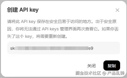| 创建后会自动生成key(它是一种用于身份验证的密钥,允许用户通过API访问特定的服务或数据。它就像一把钥匙,确保只有授权的用户才能使用服务,同时帮助控制访问频率和权限),请将这个key保存好,因为关闭后无法再次查看 |