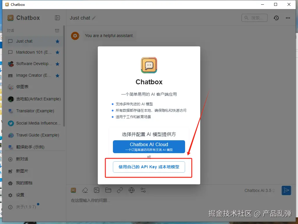 打开软件后,选择“使用自己的API Key”或本地模型