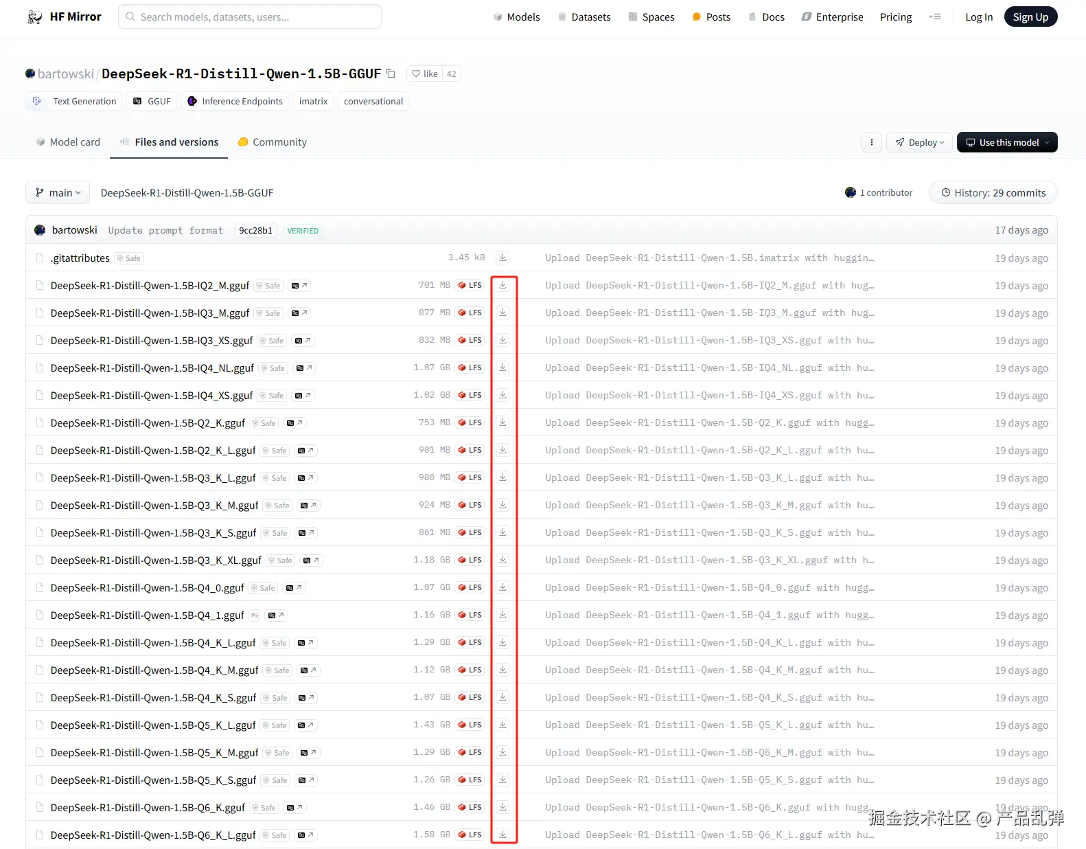 | 网页在线下载(也可以在该网站下载其他本地模型,下载文件的格式为gguf) 1.5B:hf-mirror.com/bartowski/D… 7B:hf-mirror.com/unsloth/Dee… 14B:hf-mirror.com/bartowski/D… 32B:hf-mirror.com/bartowski/D… 70B:hf-mirror.com/unsloth/Dee… 注:图中Q2、Q3、Q4等通常是指模型的量化级别,数字越大精度越高,一般选择Q4 |