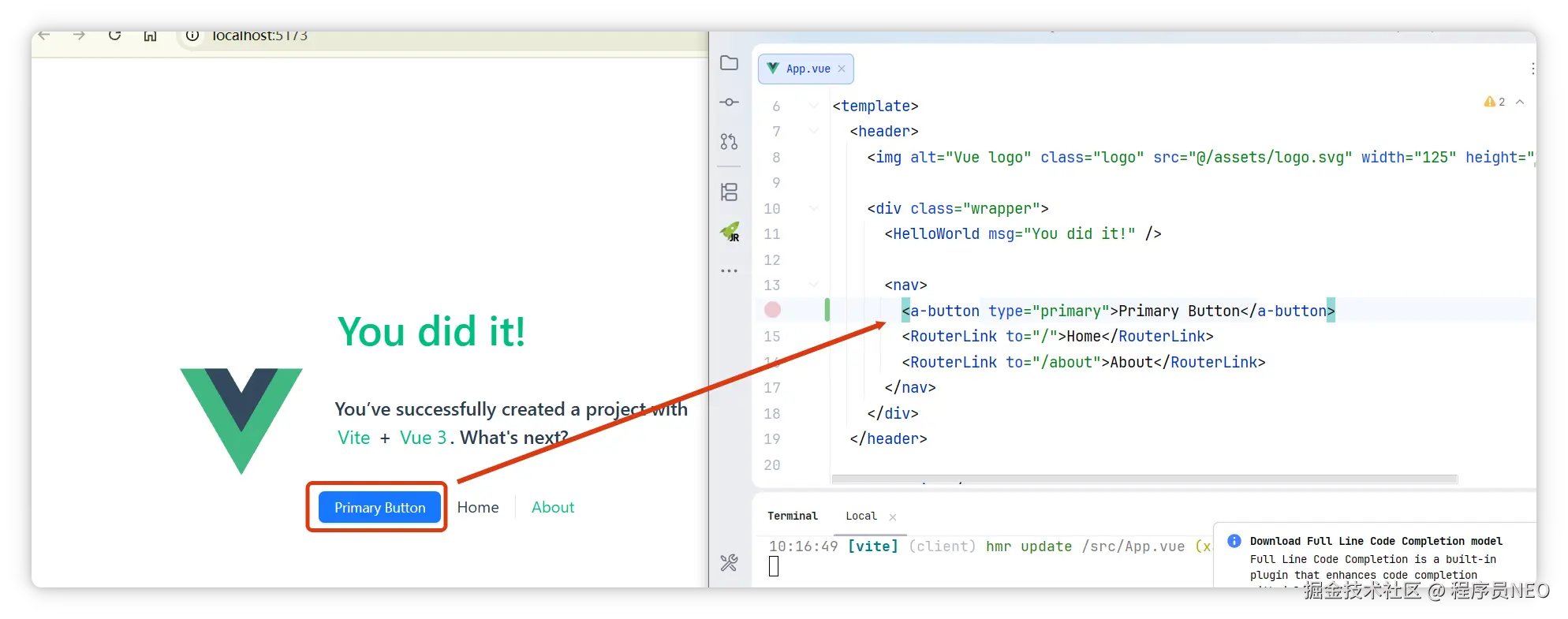 引入之后简单测试一下,随便找一个组件试用一下,在 App.vue 中,引入 Button 按钮组件: