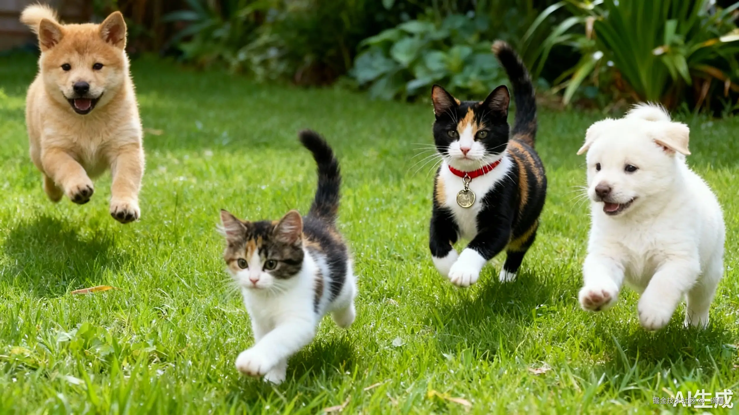 准备好以下提示词:请根据参考图生成这四只猫狗在草坪上进行相互追逐嬉戏的真实场景。