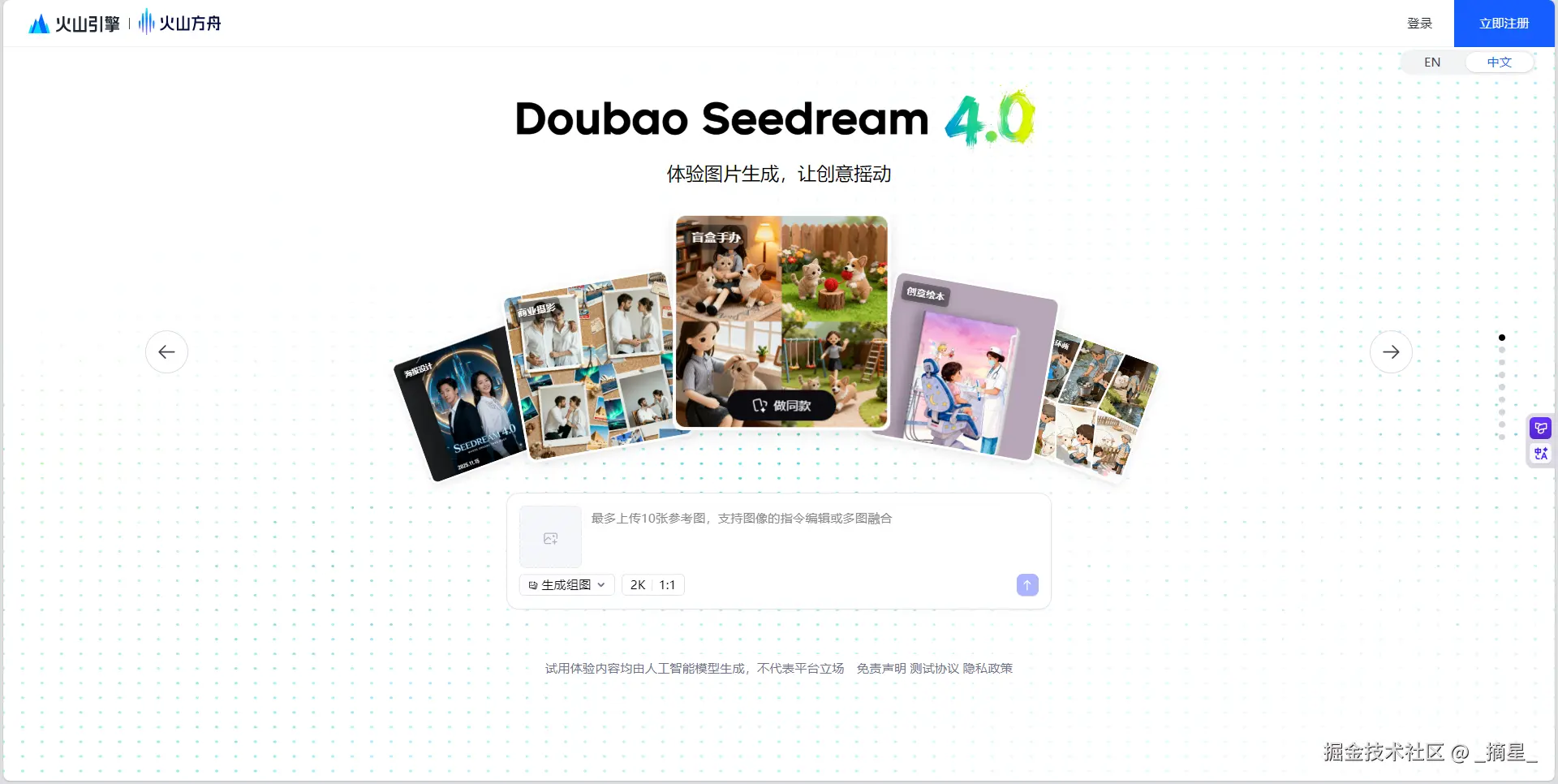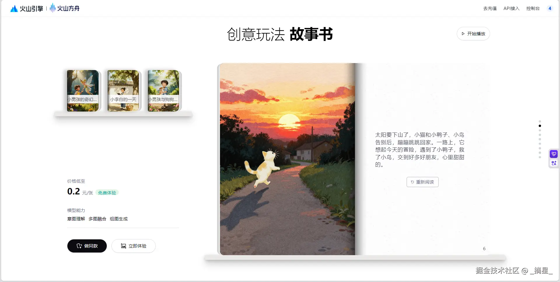 随着即梦4.0(Seedream 4.0)的发布,字节跳动旗下的火山引擎和火山方舟两大自家Mass平台自然坐不住了,近日也是立马上线了Doubao Seedream 4.0,访问[体验中心](https://www.volcengine.com/experience/ark?launch=seedream&utm_campaign=20250909&utm_content=Seedream&utm_medium=chuanbo&utm_source=kaifazhe&utm_term=kaifazhe_KOL)即可访问组图生成-创意玩法故事书