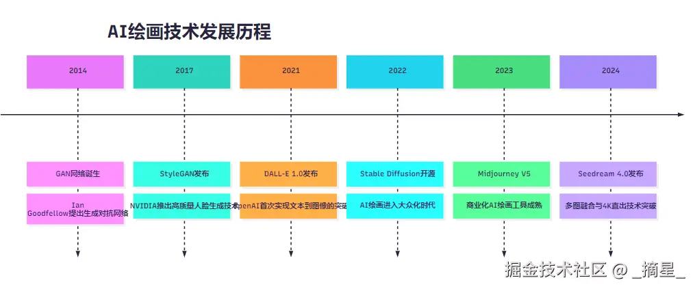 图4:AI绘画技术发展时间线 - 展示从GAN到Seedream 4.0的技术演进历程
