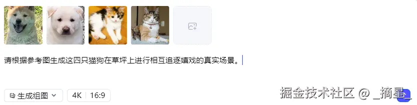 本次测评我准备了两张中华田园犬和两张三花猫的素材图片,准备以以下三个方面进行即梦4.0的创意生成,分别是:- 真实场景的猫狗追逐图