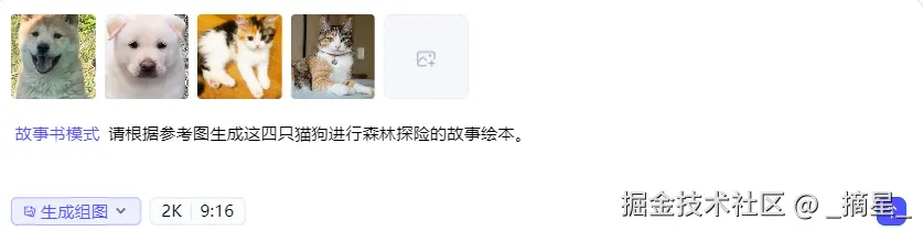 准备好以下提示词:请根据参考图生成这四只猫狗进行森林探险的故事绘本。