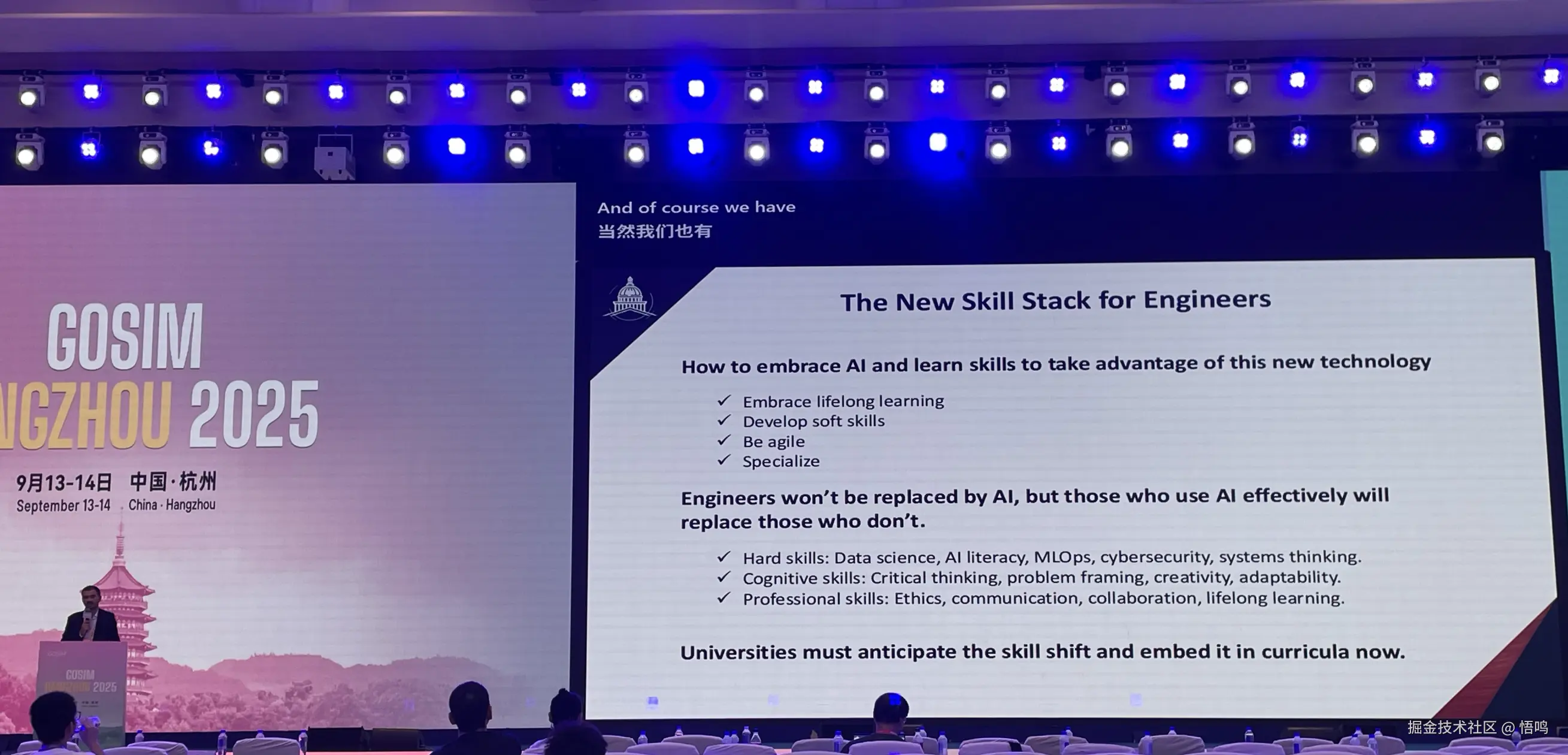 提到了 AI 时代工程师新技术栈。包括终身学习、开发软技能、保持敏捷和专业化。