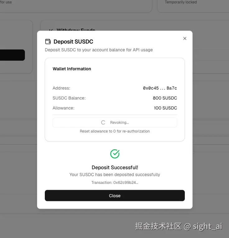 - 在 MetaMask 中批准交易(授权+deposit),等待约 1 分钟,会提示交易完成,deposit成功