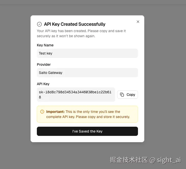 - 创建完成后,点击 Copy(复制) 保存你的 API Key此时你可以在列表页看见你已经创建的key