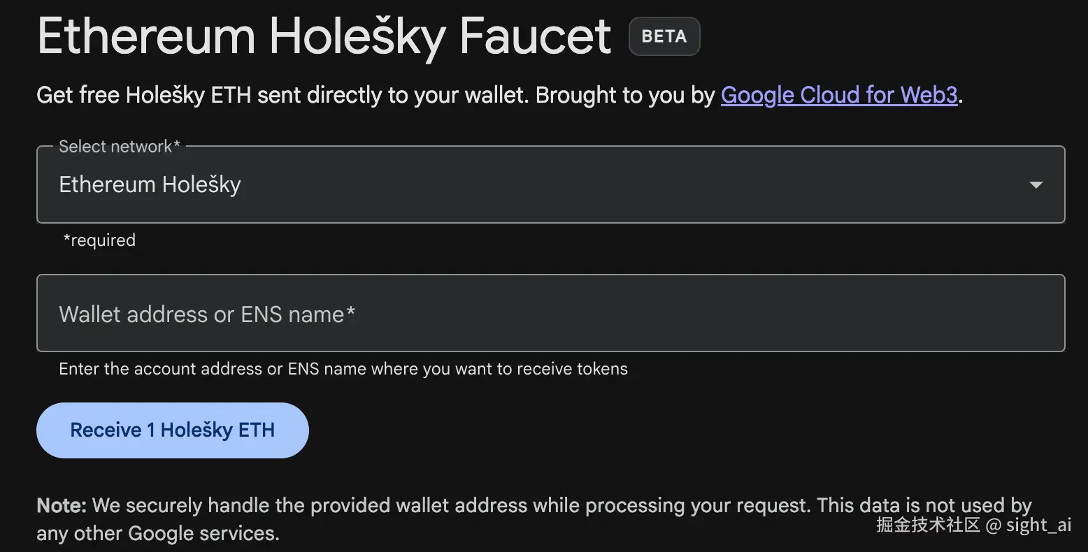 - 点击 “Receive 1 Holesky ETH” (领取 1 个 Holesky ETH)
