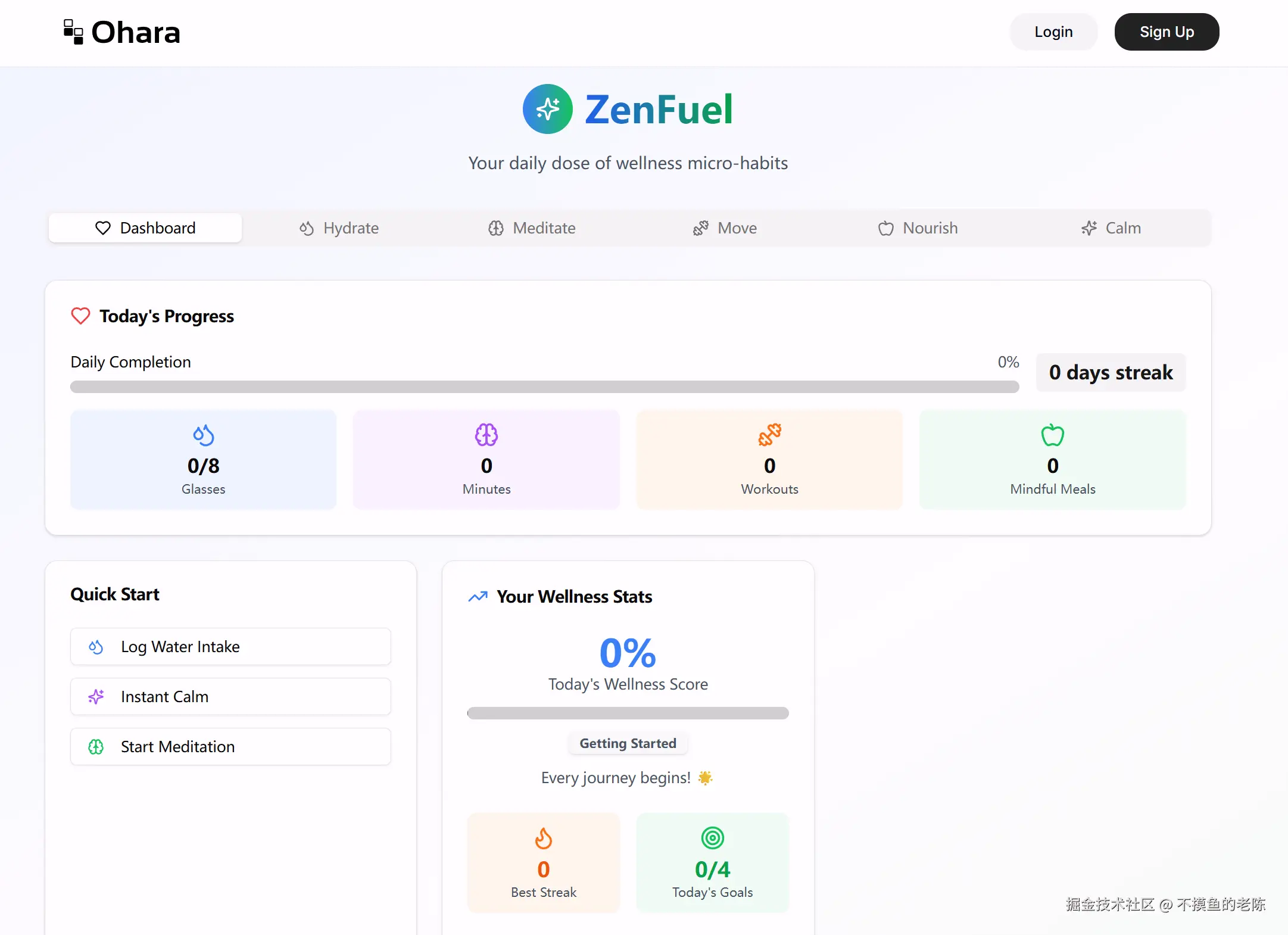 ZenFuel是一款健康管理miniapp,帮助用户建立小的每日健康习惯,包括追踪水分、快速冥想、简单锻炼和正念饮食。