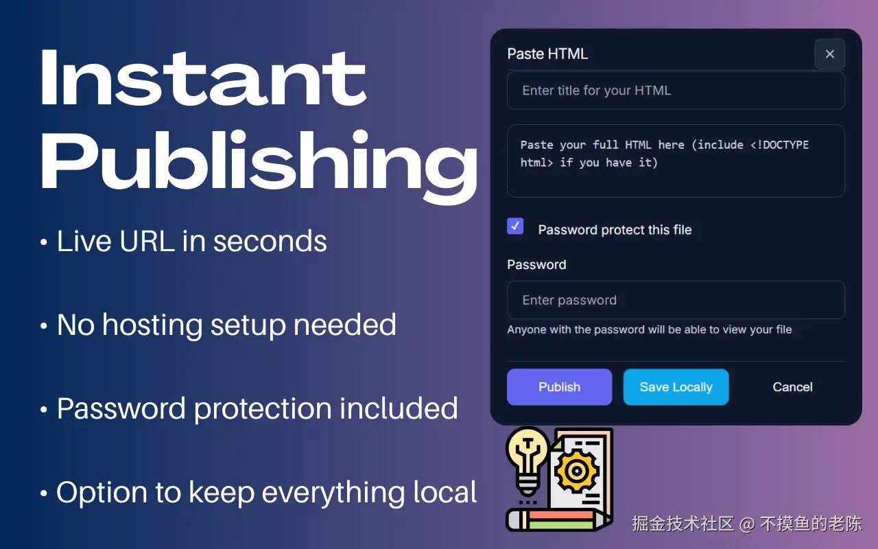 Quick Publish是一款一键发布AI生成的HTML/JS/CSS单文件应用的工具,无需Git或构建工具,提供分享链接、密码保护和基本分析功能。