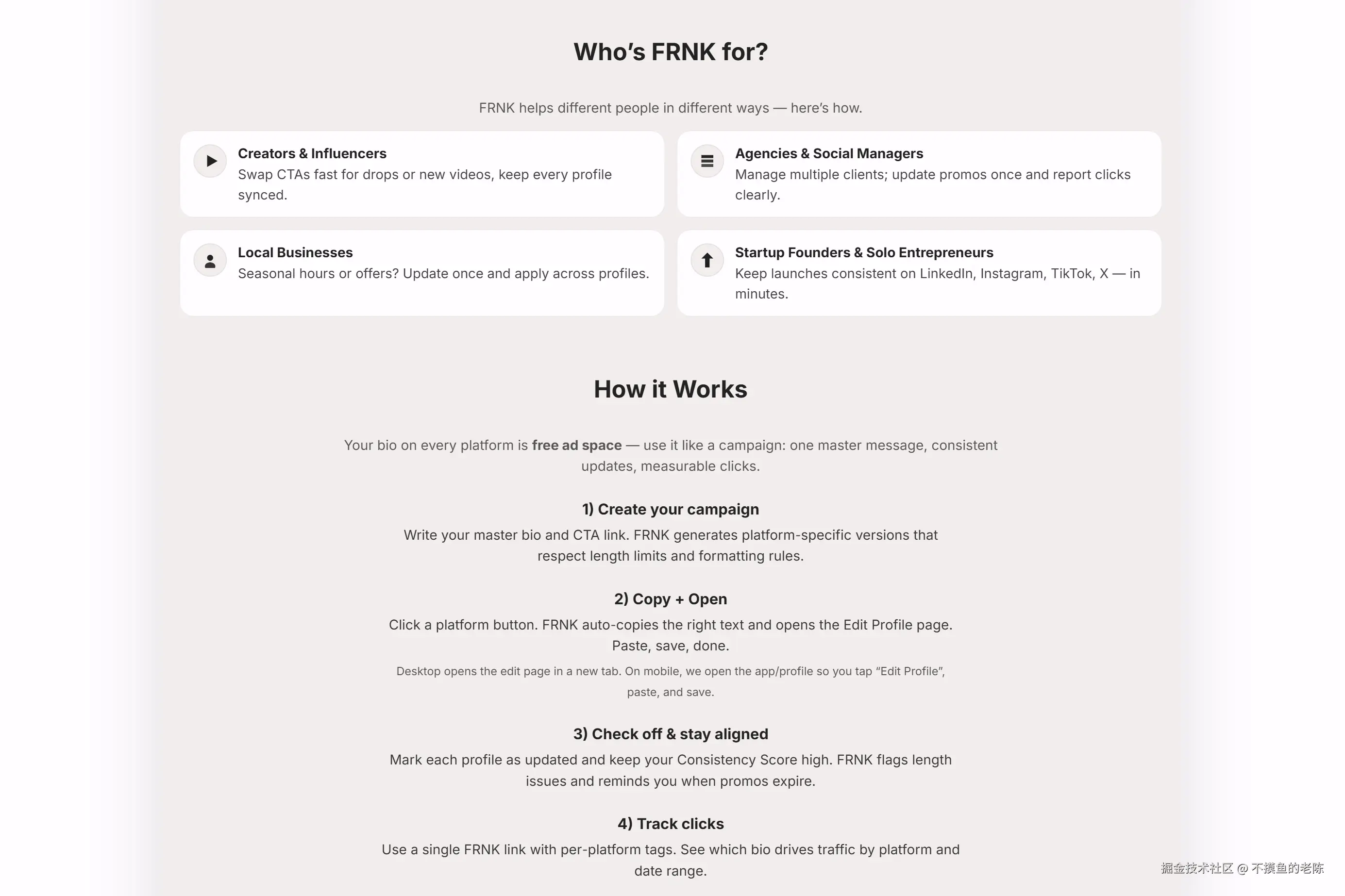 FRNK是一款社交媒体个人简介管理工具,统一管理多个平台的个人简介,保持信息一致并追踪点击量。