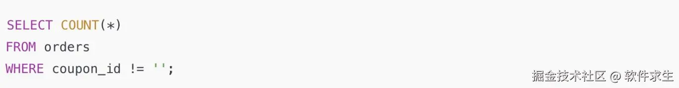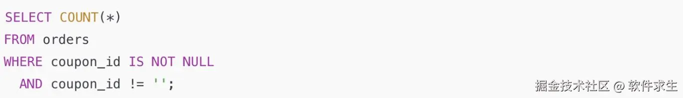 结果一跑,数字对不上。为啥?因为 coupon_id 里有些是 NULL,!= '' 对 NULL 是不成立的。MySQL 遇到 NULL 会直接返回 UNKNOWN,结果这些行就被排除掉了。