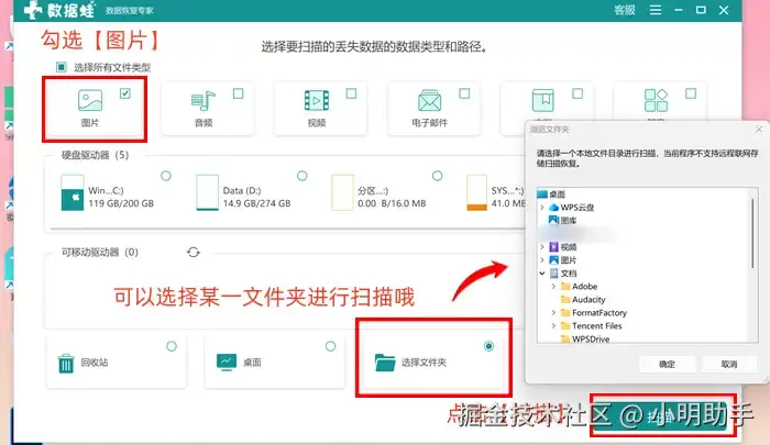 步骤1: 在电脑启动数据 蛙恢复专家后,在软件的首页上根据提示完成文件类型的选择(勾选上方的【图片】),再选择照片丢失的位置进行扫描,之后点击【扫描】按钮;