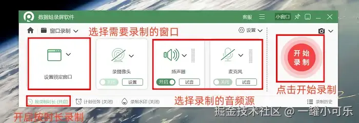 第2步:这些细节别漏了!先动手锁定录制的窗口,接着选好音频来源。如果你怕到时候忘了停止录制?还能提前设个 “按时长录制”(比如设10分钟,到点自动停) 。所有设置都弄好后,点一下开始录制就能开始录屏了。