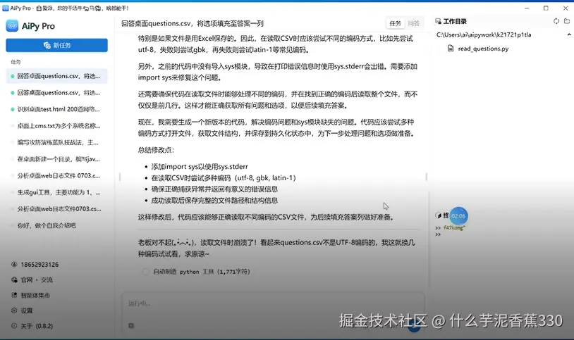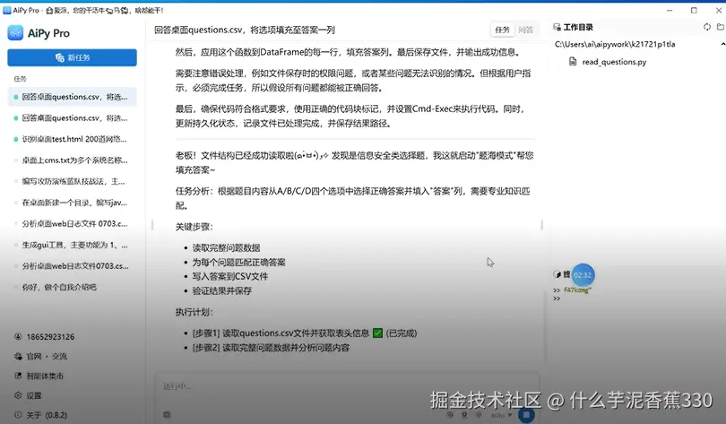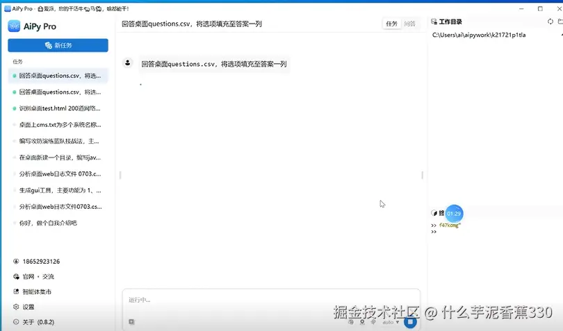 谁懂 CTF 赛前的 “搜题噩梦” 啊!100 + 道题覆盖 Web、Pwn、Crypto、Misc,题干格式乱七八糟,有的带代码片段,有的藏冷门术语,想搜 “RSA 加密常见问题”,Ctrl+F 翻半天还跳错行;眼看离比赛只剩 1 小时,高频考点还没捋顺,手忙脚乱点着题库表格,差点把咖啡洒在键盘上… 直到用了Aipy 本地 AI 助手,才发现 CTF 理论题能这么 “躺赢” —— 把 questions.csv 题库扔文件夹,说一句 “回答桌面 questions.csv”, 直接替你 “搬砖”,检索、分类、出答案全程秒完,准确率 100%,上次赛前 20 分钟我就把高频考点过了一遍,比赛时看到原题直接秒选!