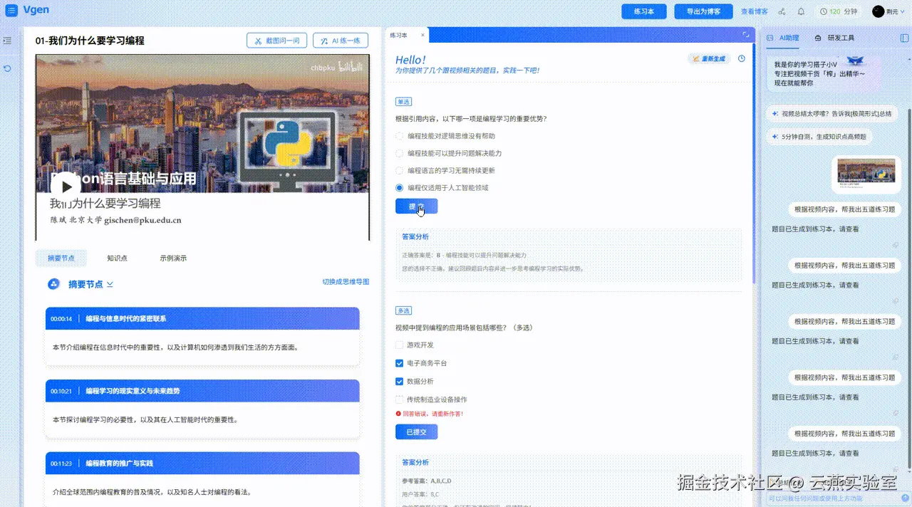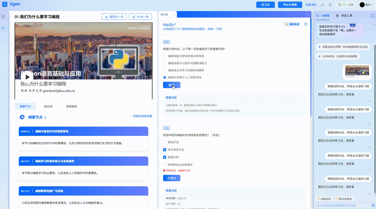 基于刚学的视频知识点,AI 自动生成练习题,单选(考概念)、多选(考辨析)、编程题(考实操)都有,完全贴合学习内容,不做无用题;