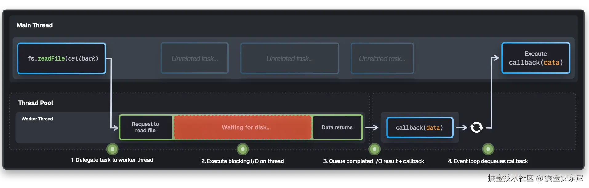 - 工作线程通过事件循环把数据推回主线程,最终调度并执行你的回调。