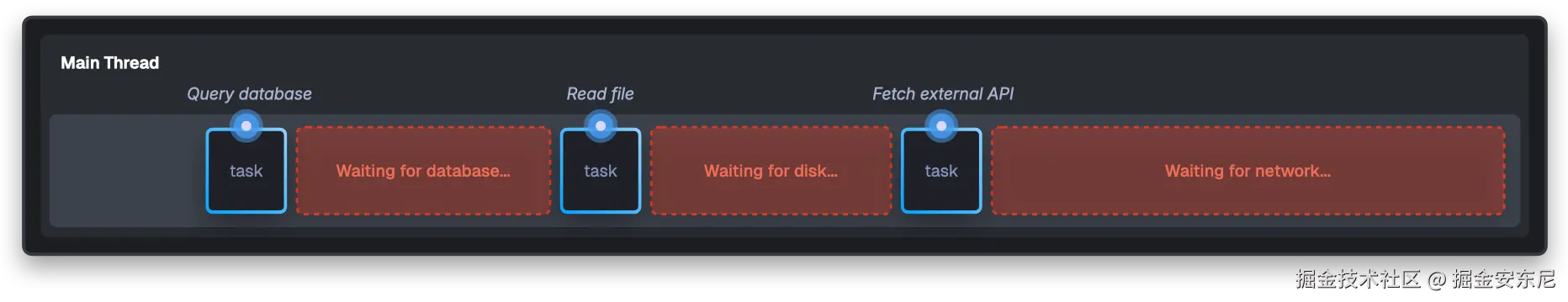 在 2009 年,一次典型的磁盘寻道需要 10ms,一次数据库查询 50–200ms,向外部 API 发起一个 HTTP 请求要 300ms+。在这些事务期间,传统服务器会……一直等着。你的服务器开始读一个文件,然后就卡住了 10ms。