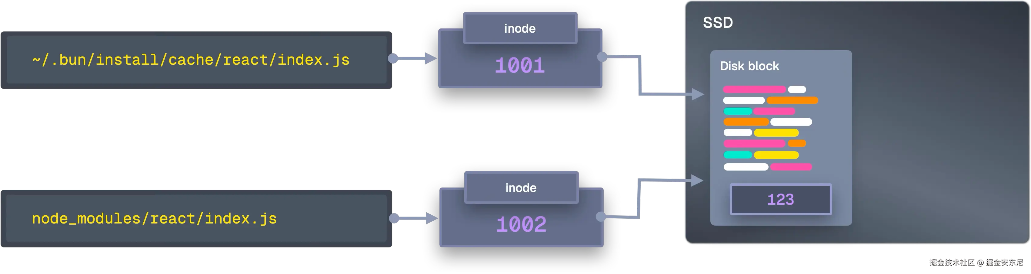 Linux 没有 clonefile(),但有更古老也更强的硬链接(hardlink)。Bun 的回退链如下(从最优到最差):