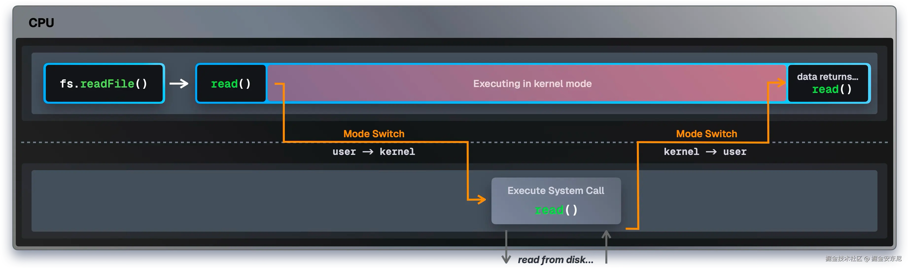 当你在程序里想打开一个文件(比如 fs.readFile())时,CPU 在用户态下不能直接读磁盘。它得先切到内核态。