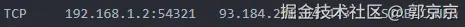 192.168.1.2通过临时端口54321,正与远程服务器93.184.216.34的 TCP 端口(443)进行双向通信中。