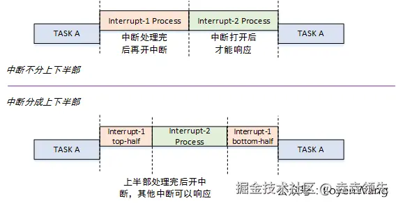 中断子系统中有一个重要的设计机制,那就是Top-half和Bottom-half,将紧急的工作放置在Top-half中来处理,而将耗时的工作放置在Bottom-half中来处理,这样确保Top-half能尽快完成处理,那么为什么需要这么设计呢?看一张图就明白了: