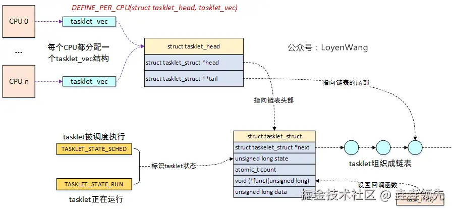 DEFINE_PER_CPU(struct tasklet_head, tasklet_vec)为每个CPU都分配了tasklet_head结构,该结构用来维护struct tasklet_struct链表,需要放到该CPU上运行的tasklet将会添加到该结构的链表中,内核中为每个CPU维护了两个链表tasklet_vec和tasklet_vec_hi,对应两个不同的优先级,本文以tasklet_vec为例;struct tasklet_struct为tasklet的抽象,几个关键字段如图所示,通过next来链接成链表,通过state字段来标识不同的状态以确保能在CPU上串行执行,func函数指针在调用task_init()接口时进行初始化,并在最终触发软中断时执行;