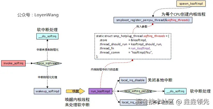 invoke_softirq函数中,根据中断处理是否线程化进行分类处理,如果中断已经进行了强制线程化处理(中断强制线程化,需要在启动的时候传入参数threadirqs),那么直接通过wakeup_softirqd唤醒内核线程来执行,否则的话则调用__do_softirq函数来处理;- Linux内核会为每个CPU都创建一个内核线程