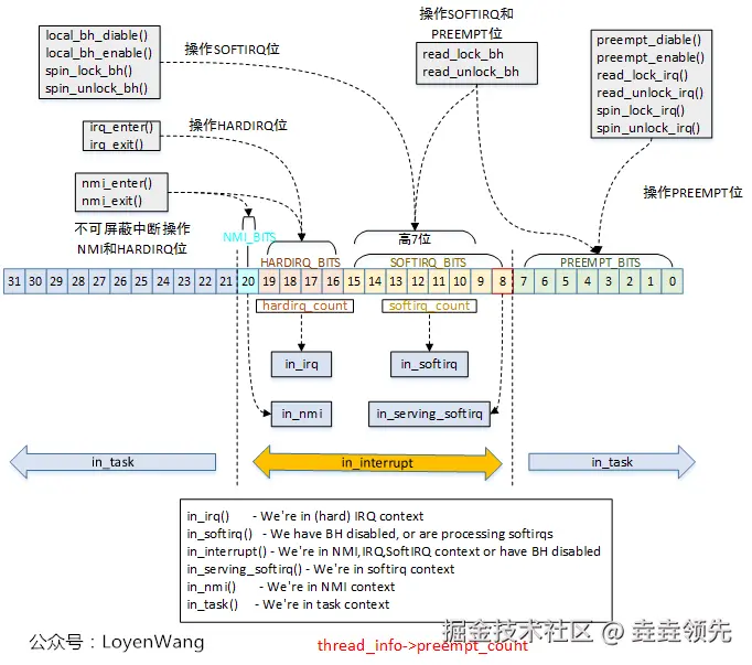 task_struct结构体中的thread_info.preempt_count用于记录当前任务所处的context状态;PREEMPT_BITS:用于记录禁止抢占的次数,禁止抢占一次该值就加1,使能抢占该值就减1;SOFTIRQ_BITS:用于同步处理,关掉下半部的时候加1,打开下半部的时候减1;HARDIRQ_BITS:用于表示处于硬件中断上下文中;
