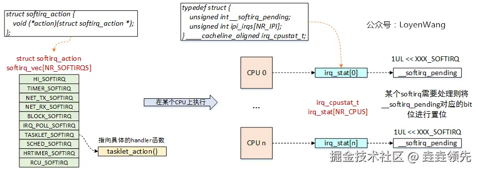 softirq_vec[]数组,类比硬件中断描述符表irq_desc[],通过软中断号可以找到对应的handler进行处理,比如图中的tasklet_action就是一个实际的handler函数;- 软中断可以在不同的CPU上并行运行,在同一个CPU上只能串行执行;