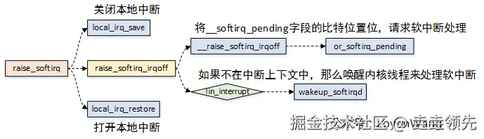 raise_softirq来进行软中断处理请求,处理的实际也就是上文中提到过的irq_exit退出硬件中断上下文之后再处理; raise_softirq_irqoff函数中,最终会调用到or_softirq_pending,该函数会去读取本地CPU的irq_stat中__softirq_pending字段,然后将对应的软中断号给置位,表明有该软中断的处理请求;raise_softirq_irqoff函数中,会判断当前的请求的上下文环境,如果不在中断上下文中,就可以通过唤醒内核线程来处理,如果在中断上下文中处理,那就不执行;- 多说一句,在软中断整个处理流程中,会经常看到