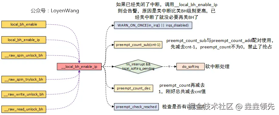 Bottom-half的接口,可以看出是spin_lock_bh/read_lock_bh/write_lock_bh等并发处理接口的变种形式调用; __local_bh_enable_ip函数中,首先判断调用该本接口时中断是否是关闭的,如果已经关闭了再操作BH接口就会告警;preempt_count_sub需要与preempt_count_add配套使用,用于操作thread_info->preempt_count字段,加与减的值是一致的,而在__local_bh_enable_ip接口中,将cnt值的减操作分成了两步:preempt_count_sub(cnt-1)和preempt_count_dec,这么做的原因是执行完preempt_count_sub(cnt-1)后,thread_info->preempt_count字段的值保留了1,把抢占给关闭了,当do_softirq执行完毕后,再调用preempt_count_dec再减去剩下的1,进而打开抢占;- 为什么在使能