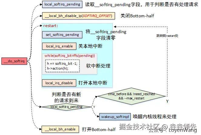 上图中的逻辑可以看出,最终的核心处理都放置在__do_softirq函数中完成: