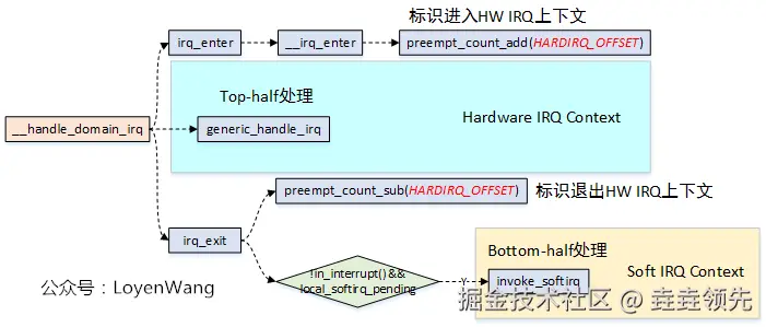 __handle_domain_irq函数中,irq_enter和irq_exit分别用于来标识进入和离开硬件中断上下文处理,这个从preempt_count_add/preempt_count_sub来操作HARDIRQ_OFFSET可以看出来,这也对应到了上文中的Context描述图; - 在离开硬件中断上下文后,如果